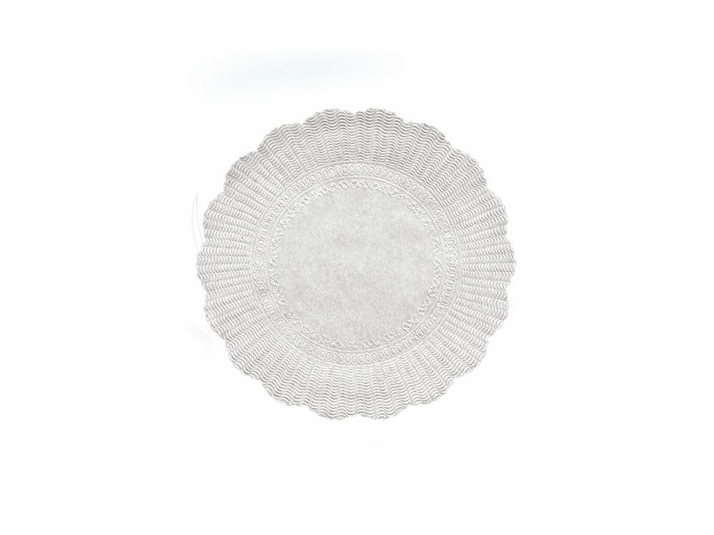 Velká bílá papírová rozetka o průměru 28 cm. Elegantní podložka pro servírování dortů, koláčů a slavnostních pokrmů. Výhodné balení 500 ks.